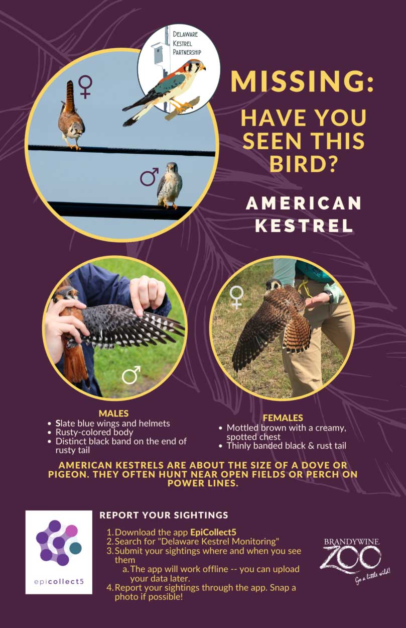 The Brandywine Zoo’s American Kestrel nest box program started in 2014 and was the first in-situ field conservation project conducted by the Zoo. To this day, we are committed to learning as much about this small falcon as we can. From 2014-16, the Zoo operated primarily independently in installing and monitoring nest boxes, but in 2016 we formally created the Delaware Kestrel Partnership (DKP) to include other resource partners in the state in this effort to study Kestrels. This Partnership has allowed the Zoo to develop protocols and knowledge sharing opportunities, investigate historic Kestrel research in Delaware, and work as a group to determine the underlying cause(s) to Kestrel population decline in the state.