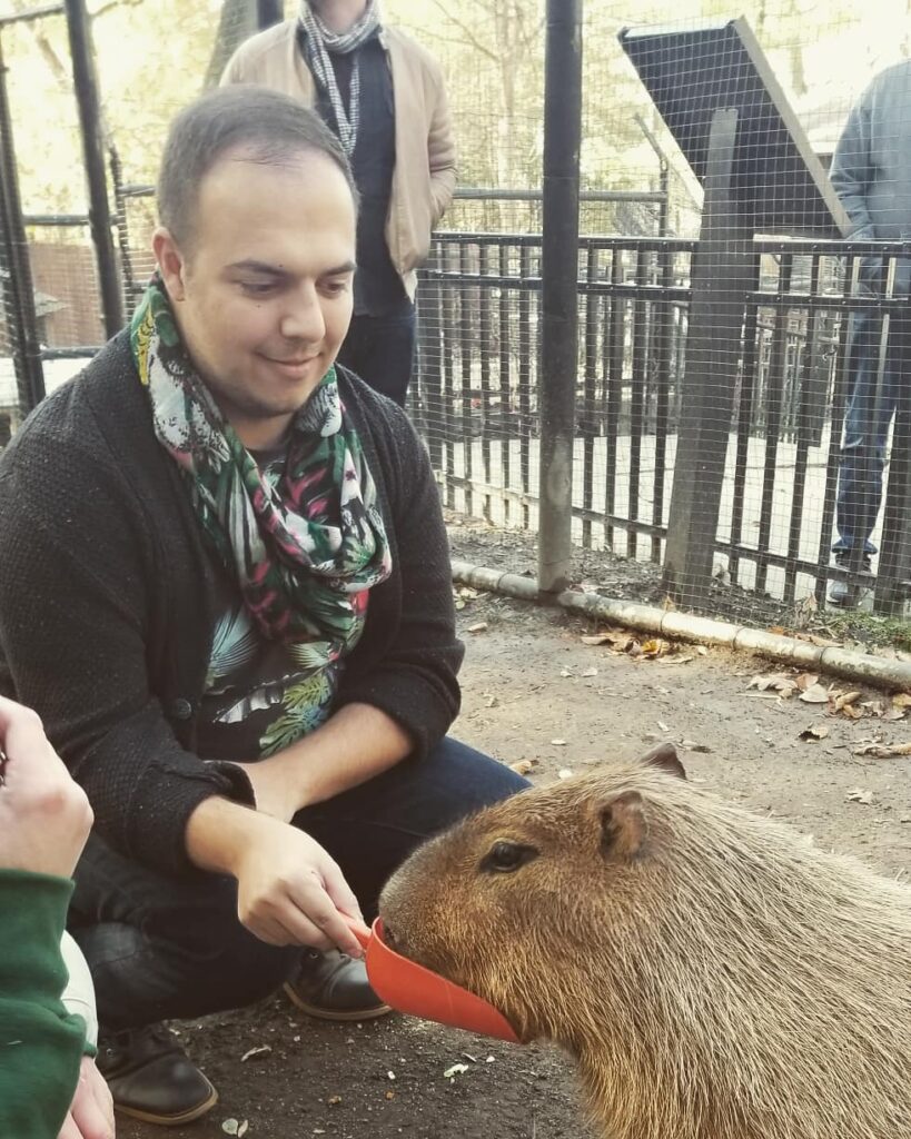 My husband Nate and I fell in love with the Brandywine Zoo in 2019. We’ve been coming for many years and one day we entered the Zoo’s auction to meet Candace the Capybara. We won the visit and we were both able to meet and feed Candace. She was so gentle and nice and we were so thankful that the Brandywine Zoo was able to provide her a furever home with her duck and Ibis friends. We were gifted with a painting that Candace created as well. We know that Candace crossed the rainbow bridge but no matter what she will have a special place in our hearts.