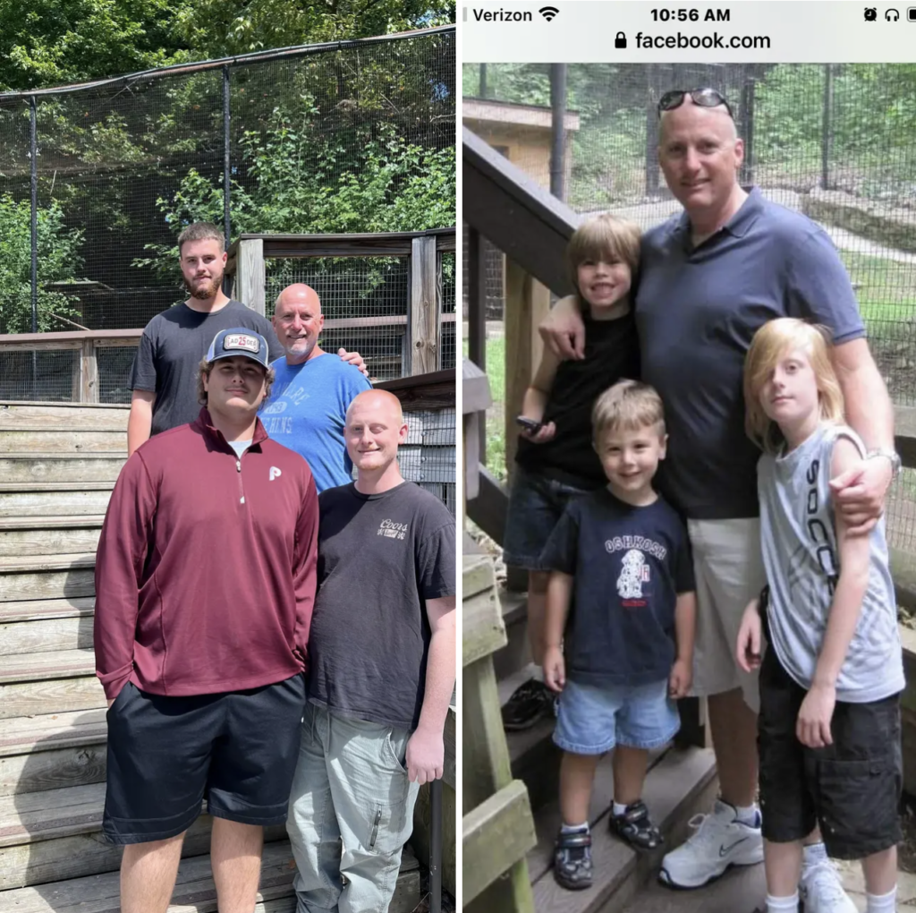 I have been bringing my sons to the Brandywine zoo since before they could walk. I find this a great smaller venue to capture their attention without overwhelming them. Now that my sons are older, I brought them back to the zoo to re-create a photo, “more from my memory than theirs“ to carry on our legacy. this picture shows a 15 year age gap. We are aligned the same way in both pictures. My son‘s in the new picture are at the very top, Jake Hower, 22 the tall gentleman in the maroon Philly shirt is Aidan Hower. he is 19 and the gentleman to my left is Bruce Hower and he is 26.